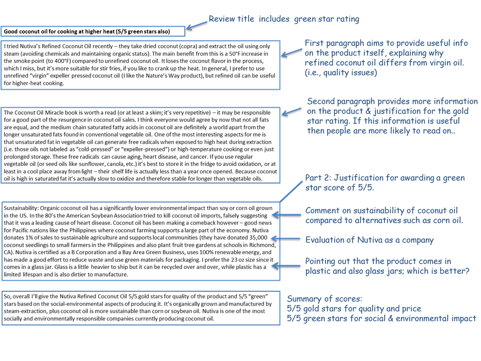 Overall, the product doesn’t hit every single target – for example it isn’t Fair Trade certified, although Nutiva does support local farmers in various ways. But it does, in this reviewer’s opinion, rank in the top 10% in terms of social and environmental impact, which translates into 5/5 green stars. You may differ on your rating, and that’s the whole point – we need a consensus based on several opinions. Start reviewing now!