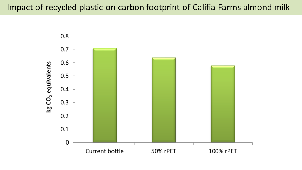 The chart above shows results of analysis (in the same paper) that the carbon footprint of Califia Farms milk would be significantly reduced by replacing the current packaging with a bottle made from recycled plastic (rPET). Perhaps even more important than reducing the carbon footprint, the incorporation of rPET into the packaging would divert waste from landfill and help create a market for recycled plastic.
