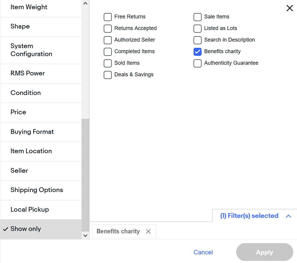 That opens a new window and the second last item in this window is a checkbox for Benefits charity. Click the Apply button and now the results will show only the items that benefit charities.