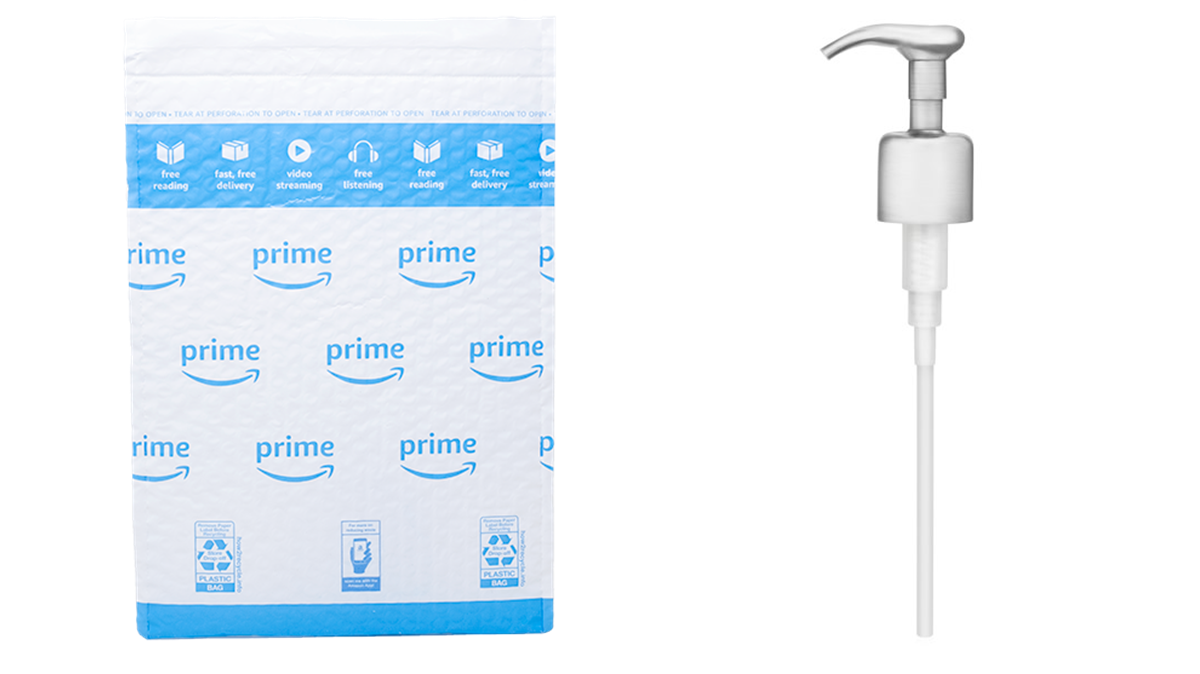 A realistic guide to recycling: California’s plastic problem. Two items that aren't readily recyclable are shown - an Amazon bubble envelope and a soap dispenser top.