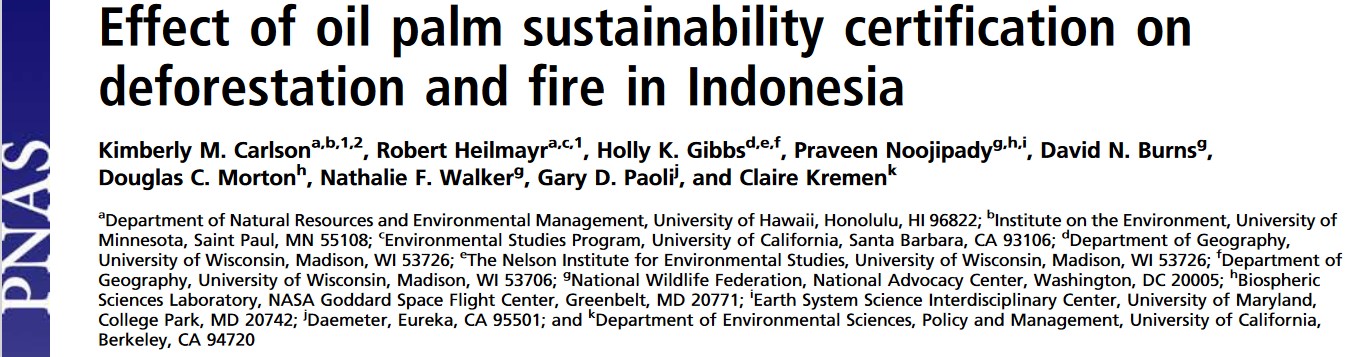 However, I wanted to revisit this issue to check if RSPO certification is better than I had previously thought, so I went back to the scientific literature on the topic. A paper published in one of the most reputable journals (PNAS) by an assortment of scientists from multiple universities (from Hawaii to UC Berkeley) best fits the bill as being an objective evaluation of the issue. Also published in 2018, it’s titled Effect of oil palm sustainability certification on deforestation and fire in Indonesia.