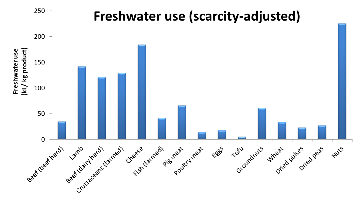 These water footprint numbers include an adjustment for water scarcity (focus on the trend rather than the values on the Y-axis). Without adjustment for water scarcity the trend is similar although cheese occupies the top spot, with a footprint of 5700 liters of freshwater per kg of cheese, while nuts require 4000 L/kg. Tofu has the lowest footprint in both scenarios, with an absolute water footprint of less than 150 L/kg.