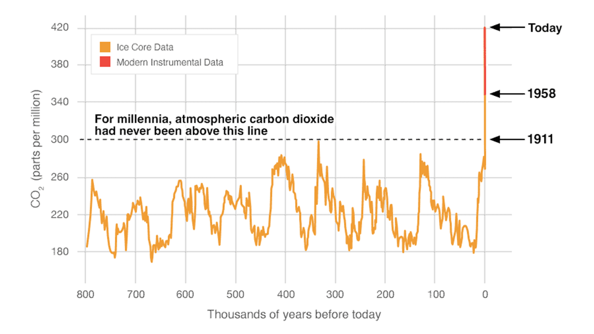 You’re familiar with this one, so I won’t say too much about it here. But as a quick reminder, here’s a chart from NASA showing how the amount of CO2 in our atmosphere stayed within certain limits for around a million years, never exceeding 300 ppm (0.03%) until around the year 1911. Its rise over the last century has been alarming (but also predictable) and now exceeds 420 ppm.