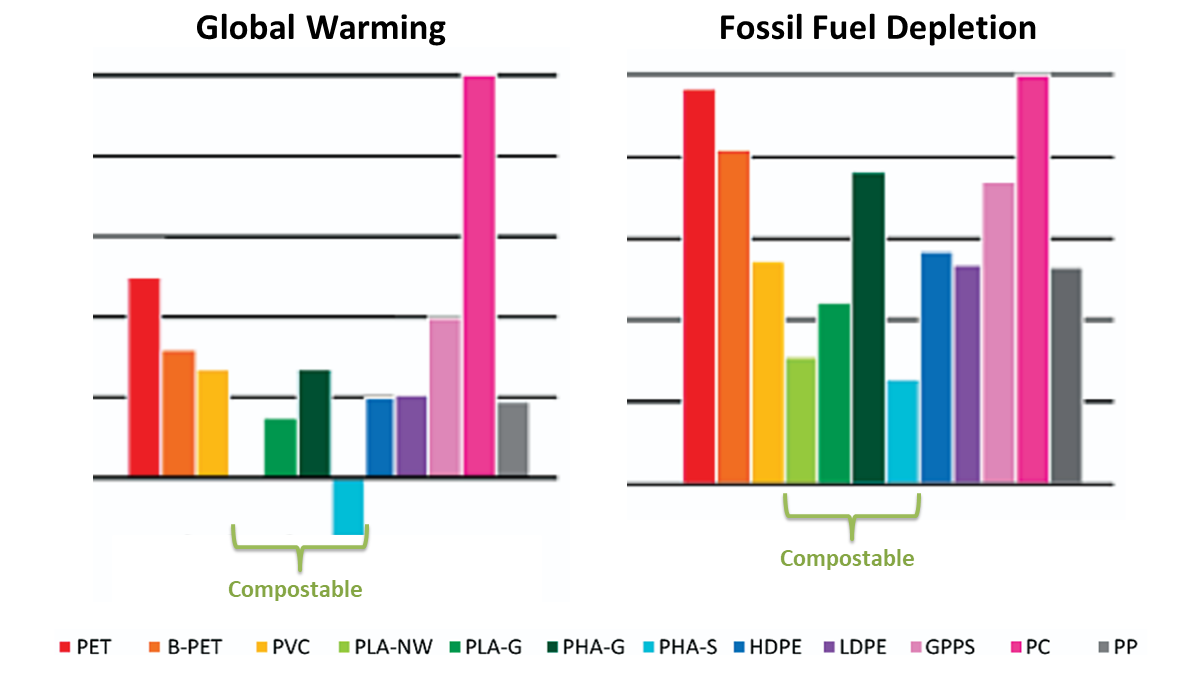 Again, the compostable plastics, PLA and PHA are among the best options when it comes to reducing the carbon footprint of plastics. The exact size of these footprints depends on how the compostable plastics are made.