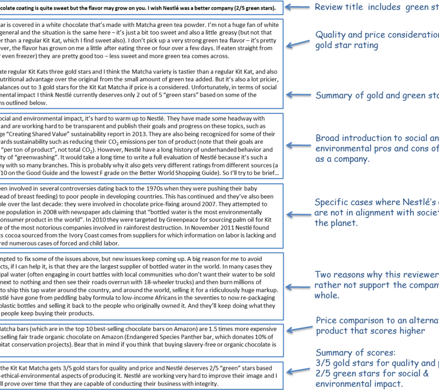 Here’s another review that serves as an example of how to incorporate both gold star and green star ratings (you can see more examples here). In this case the product is made by one of the largest corporations on the planet, which provides some challenges when it comes to evaluating the product and company (more on that below). The review, like all these example reviews, … Continue reading Nestlé Kit Kat Matcha Review